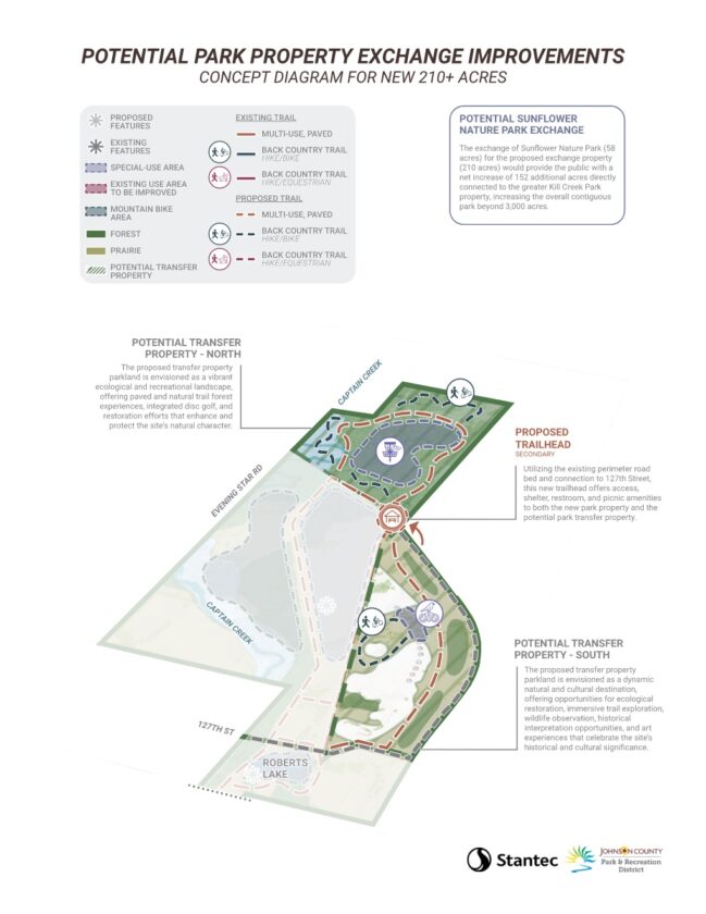 The Johnson County parks department has also heard public feedback from residents that celebrate the potential to protect more land, but also many people who have said they really liked Sunflower Nature Park and were concerned about it not being protected, Nowotny said. He said the open house dedicated to the Sunflower Nature Park land exchange potential will be a key way to get that specific feedback regarding the transfer from residents from either side of the county line — especially since a potential trailhead for the land in the southwest could be next to 127th Street, which is 1100 Road in Douglas County.