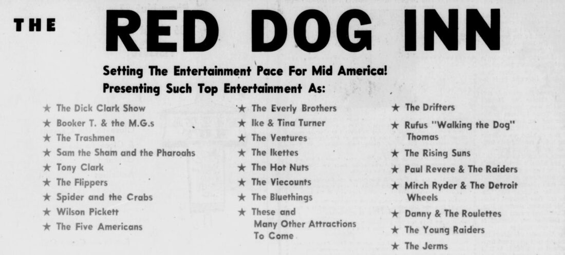 “The dancing area in the Red Dog Inn is, by far, the largest in Lawrence, and the entertainment is, by far, the best,” according to an ad in the Journal-World archives dating back to 1965. “This is the largest and most spectacular thing to hit the mid-American entertainment scene.”