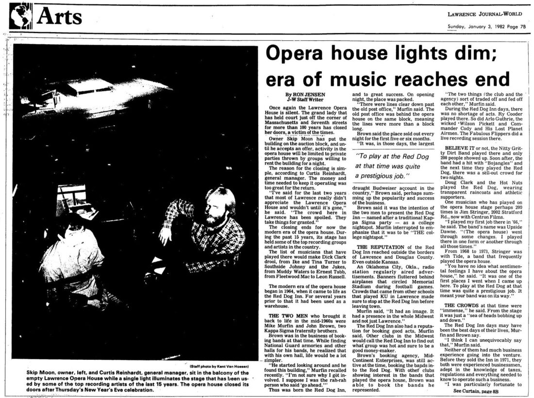 A newspaper clipping from Lawrence Journal-World archives about Red Dog Inn owners John Brown and Mike Murfin in 1982.