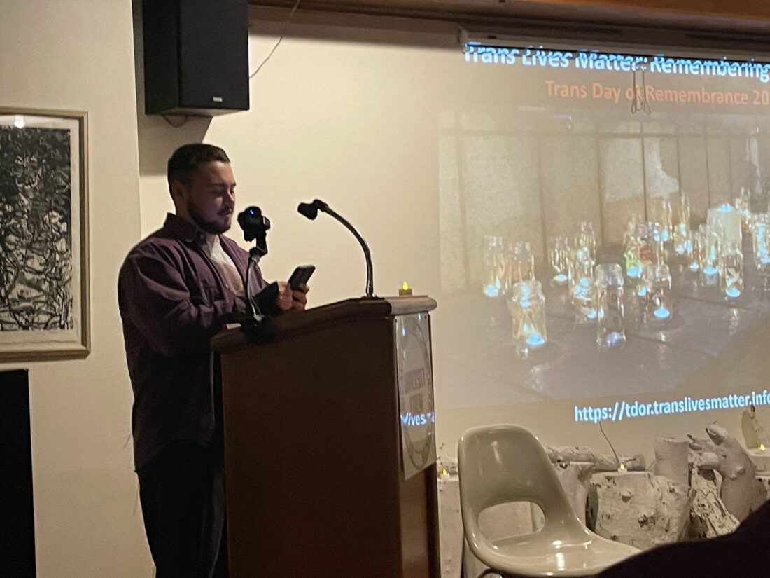 Griffin Weber speaks at a Transgender Day of Remembrance event Thursday, Nov. 20, 2025, at Ecumenical Campus Ministries.