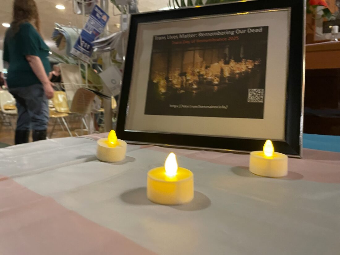 Flameless candles illuminate a display at a Transgender Day of Remembrance event Thursday, Nov. 20, 2025, at Ecumenical Campus Ministries.
