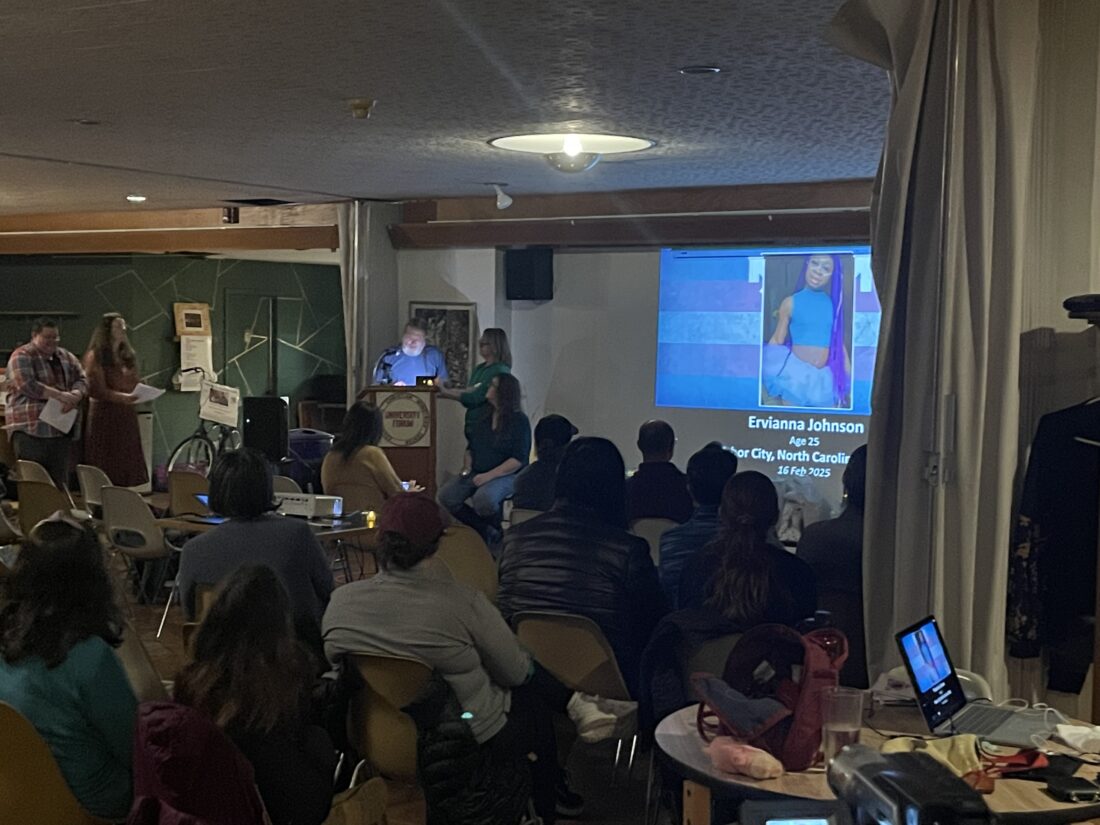 Attendees listen as the list of names is read at a Transgender Day of Remembrance event Thursday, Nov. 20, 2025, at Ecumenical Campus Ministries.