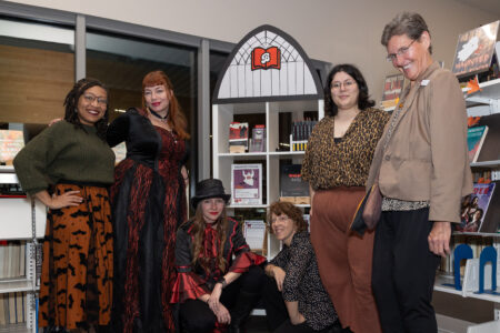 Polli Kenn, a Readers’ Services Supervisor with the Lawrence Public Library (second from left), with other Readers' Services staff during the library's 2023 "Haunted Stacks" event with books and a scavenger hunt. Celebrations and events like that are part of the library's "Booktoberfest," now in its fifth year, that aims to create communities and connect residents to library resources.
