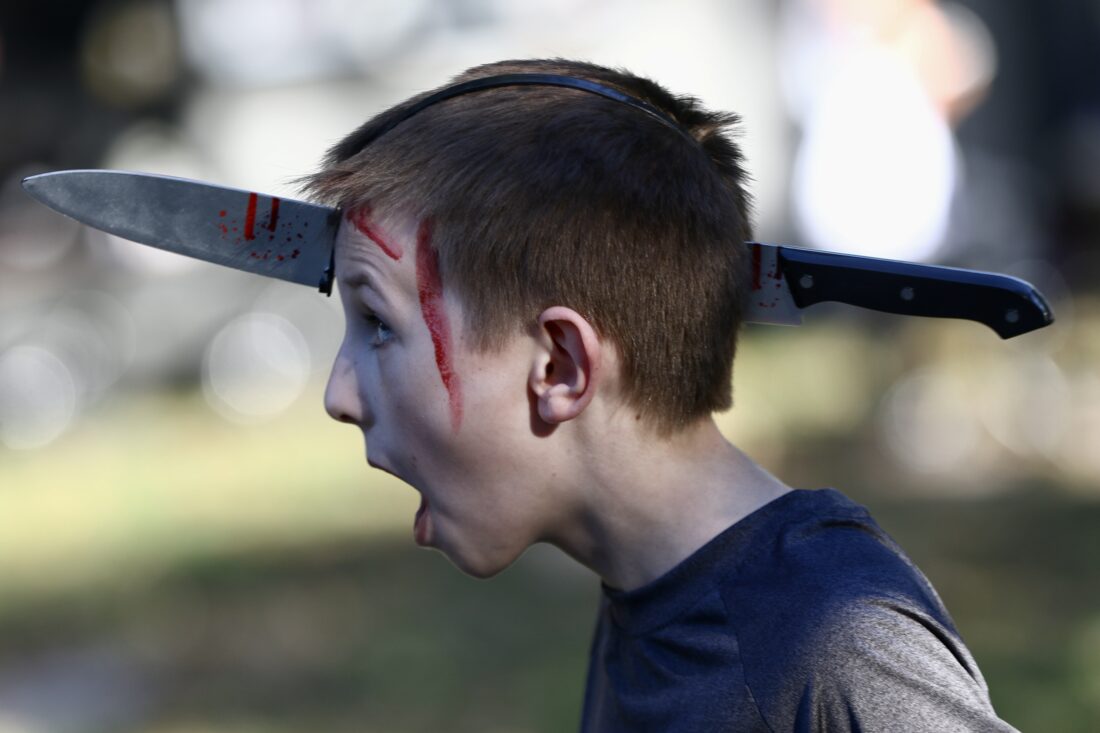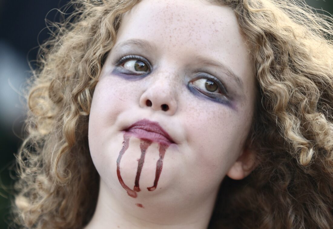 A boy displays evidence that he is a zombie during the 18th Annual Lawrence Zombie Walk that took place Thursday, October 16, 2025 in Lawrence.