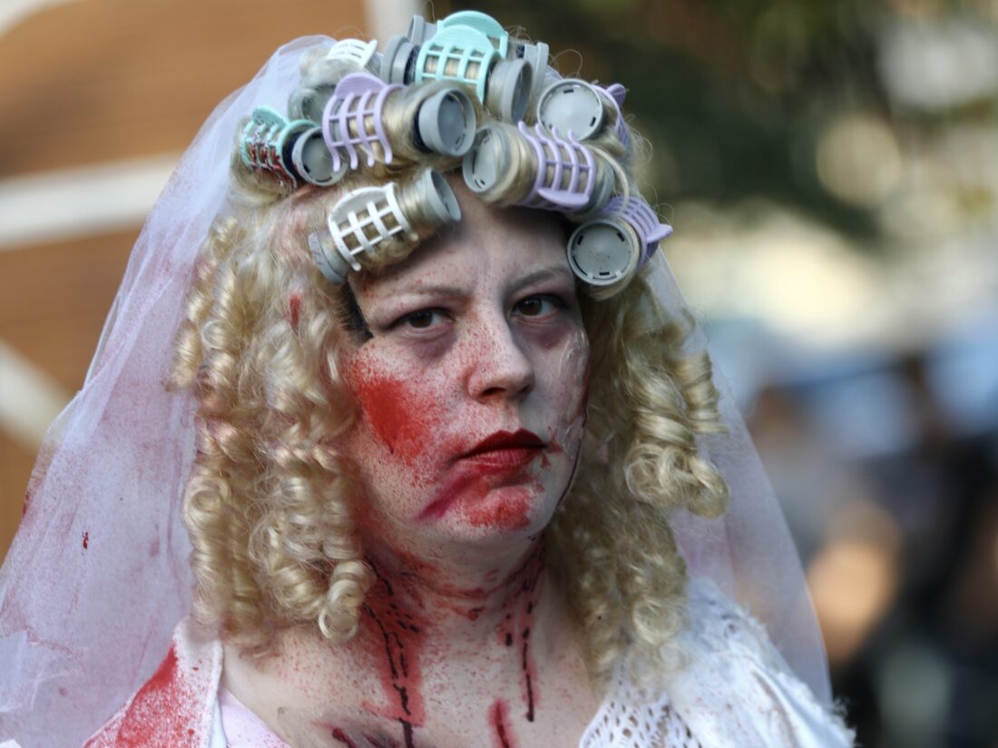 Pam Walters, Overland Park, shuffles through South Park as a zombie bride-to-be for the 18th Annual Lawrence Zombie Walk that took place Thursday, October 16, 2025 in Lawrence.