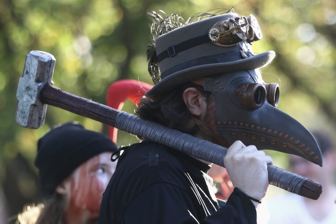 A zombie walker wears a Black Plague mask and carries a sledge-hammer during the 18th Annual Lawrence Zombie Walk that took place Thursday, October 16, 2025 in Lawrence.