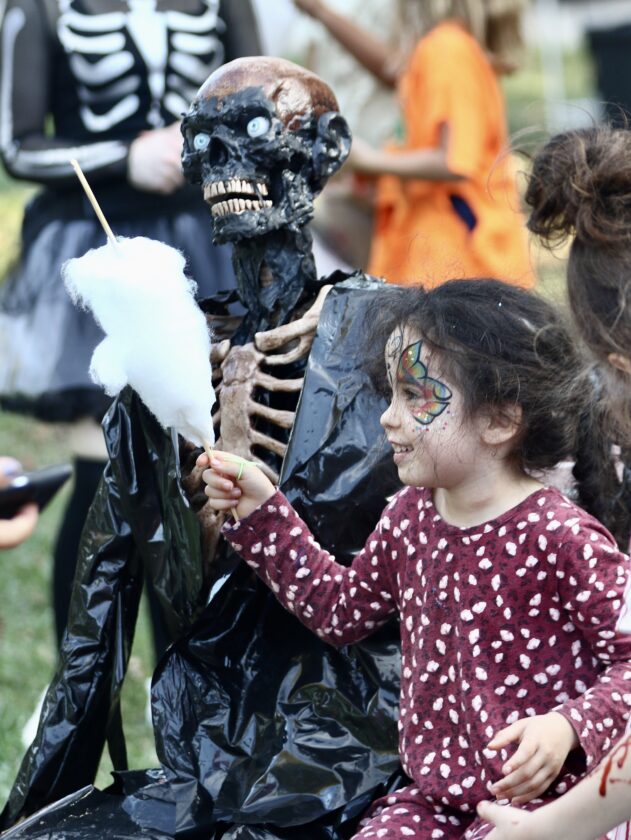 Alesia Gonzalez, 4, Lawrence, offers her zombie friend some of her cotton candy at the 18th Annual Lawrence Zombie Walk that took place Thursday, October 16, 2025 in Lawrence.
