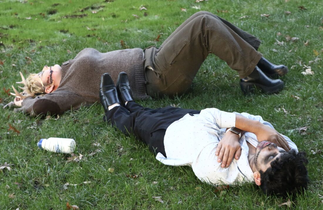 Two tired zombies rest on the South Park grass while they wait to participate in the 18th Annual Lawrence Zombie Walk that took place Thursday, October 16, 2025 in Lawrence.