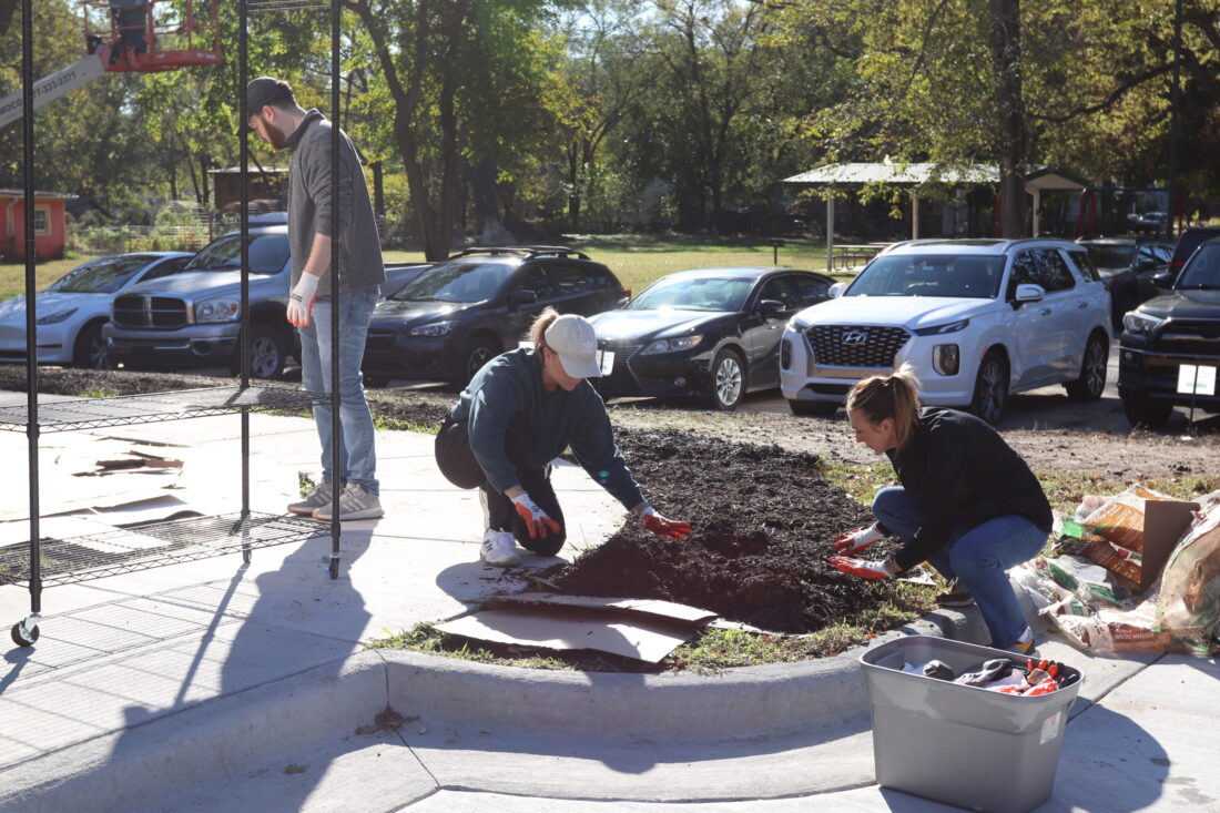 Volunteers with the Ballard Center apply mulch outside of the new building addition on Friday, Oct. 31, 2025.