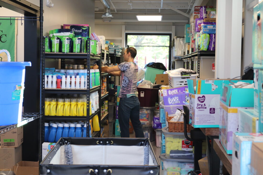 Volunteers were organizing dozens of totes and boxes of clothes, shoes, food, diapers, work attire, kitchenware, household items and more to fill all the shelves for the pantry’s opening at 9 a.m. on Monday.