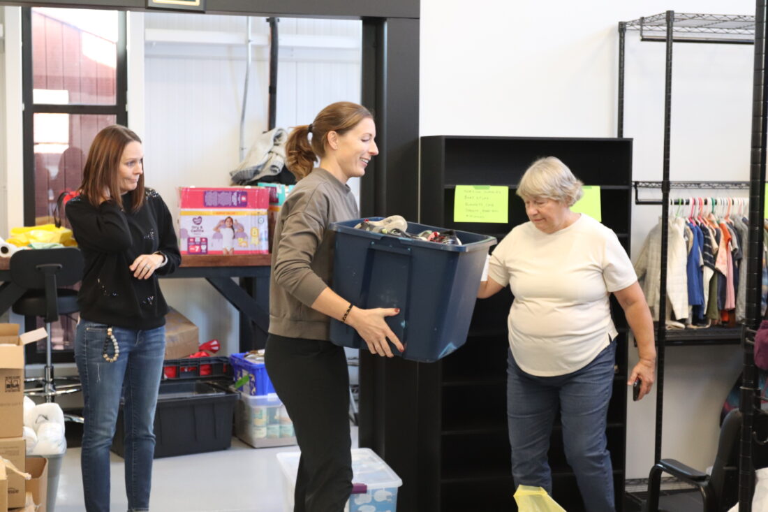 Volunteers with the Ballard Center organize clothes, shoes, food and other items in the new building addition on Friday, Oct. 31, 2025.