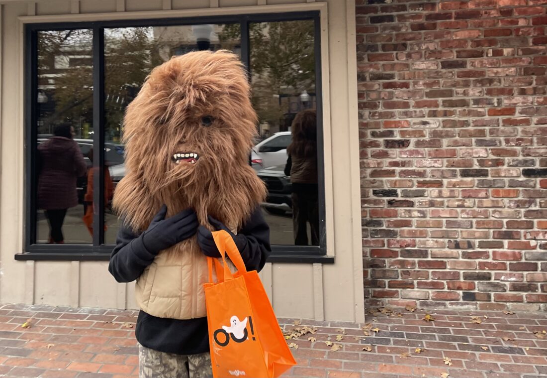 A trick-or-treater sports a Chewbacca mask during the downtown Lawrence trick-or-treat on Friday, Oct. 31. 2025.