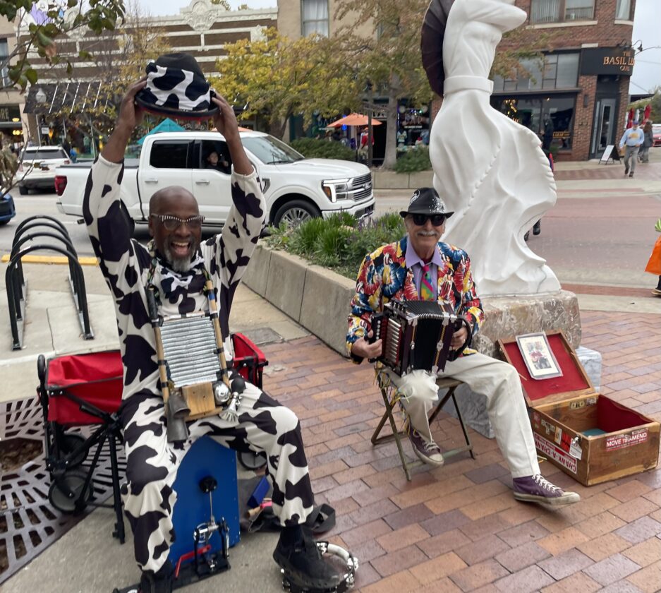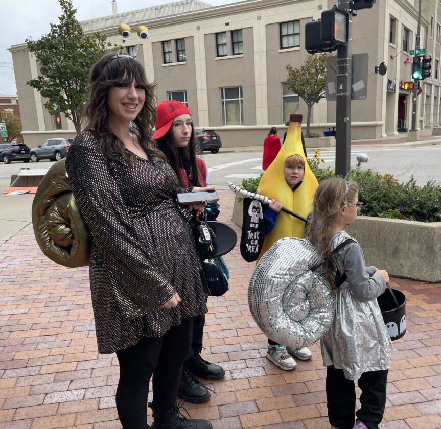 Festively dressed musicians play at Eighth and Massachusetts during the downtown Lawrence trick-or-treat on Friday, Oct. 31. 2025.