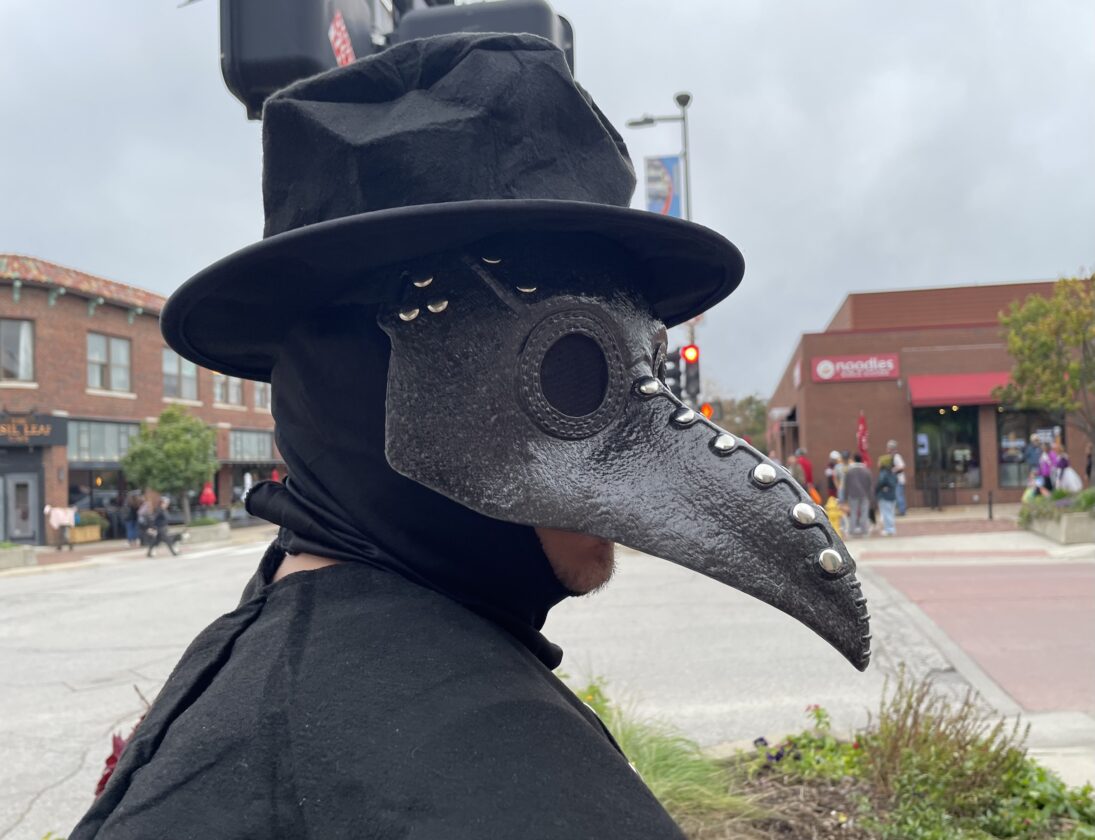 A plague doctor waits at the corner of Eighth and Massachusetts streets during the downtown Lawrence trick-or-treat on Friday, Oct. 31. 2025.