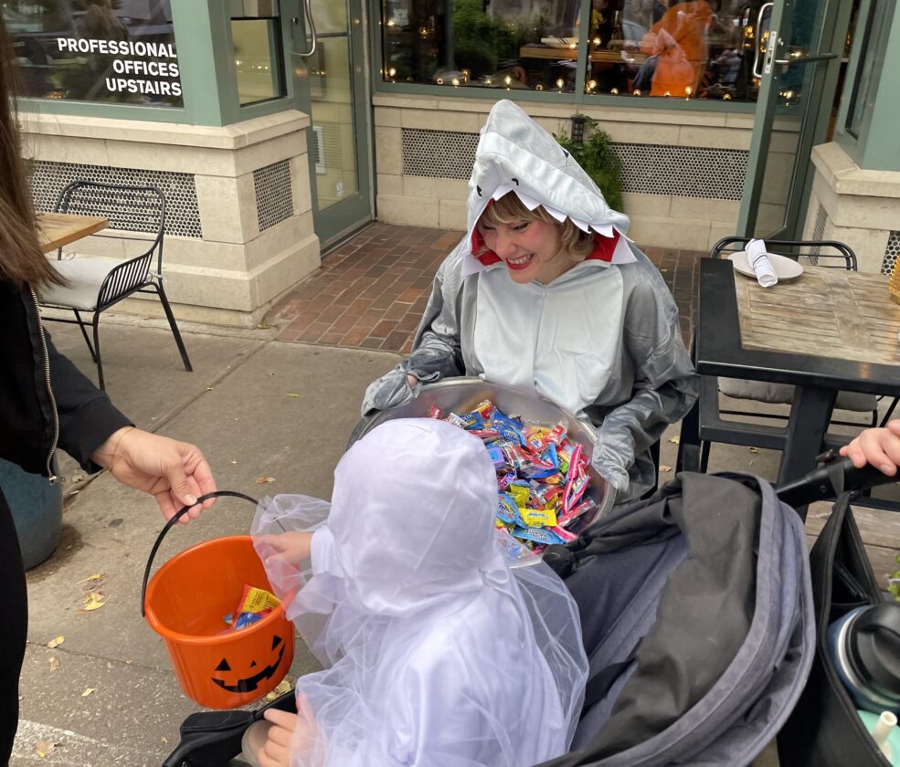 A shark hands out candy outside of Mass St. Fish House & Raw Bar during the downtown Lawrence trick-or-treat on Friday, Oct. 31. 2025.