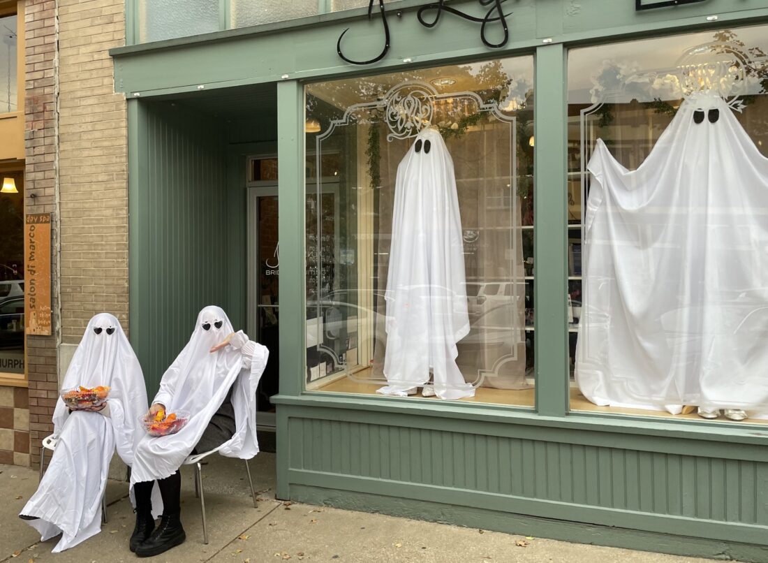A gathering of ghosts at J.Lynn Bridal during the downtown Lawrence trick-or-treat on Friday, Oct. 31. 2025.