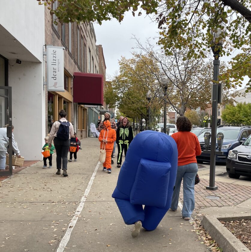 A trick-or-treater in an inflatable suit strolls down Mass. Street during the downtown Lawrence trick-or-treat on Friday, Oct. 31. 2025.