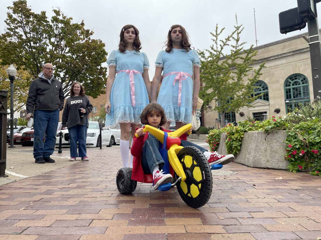 Deidre Backs and Pierluca Di Pasquale as the twins from “The Shining” during the downtown Lawrence trick-or-treat on Friday, Oct. 31. 2025.