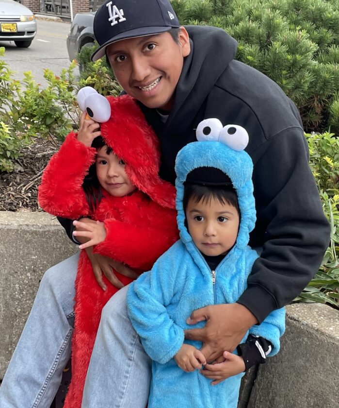 Jaimee, center, poses with Olivia, dressed as Elmo, and Mateo, as Cookie Monster, during the downtown Lawrence trick-or-treat on Friday, Oct. 31. 2025.