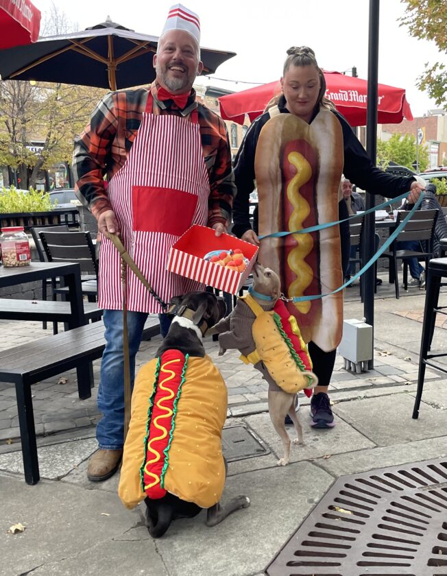 Cody and Sara Cummings dressed up with their dogs Nash, left, and Vinny on Friday, Oct. 31. 2025, on Massachusetts Street.