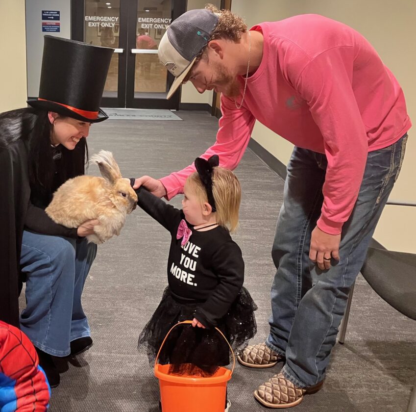 Paisley, 2, got more than candy Friday when she trick-or-treated at the Judicial and Law Enforcement Center. Judge Blake Glover’s administrative assistant, Lacy Gaultney, was on hand with her Angora rabbit Foofy.