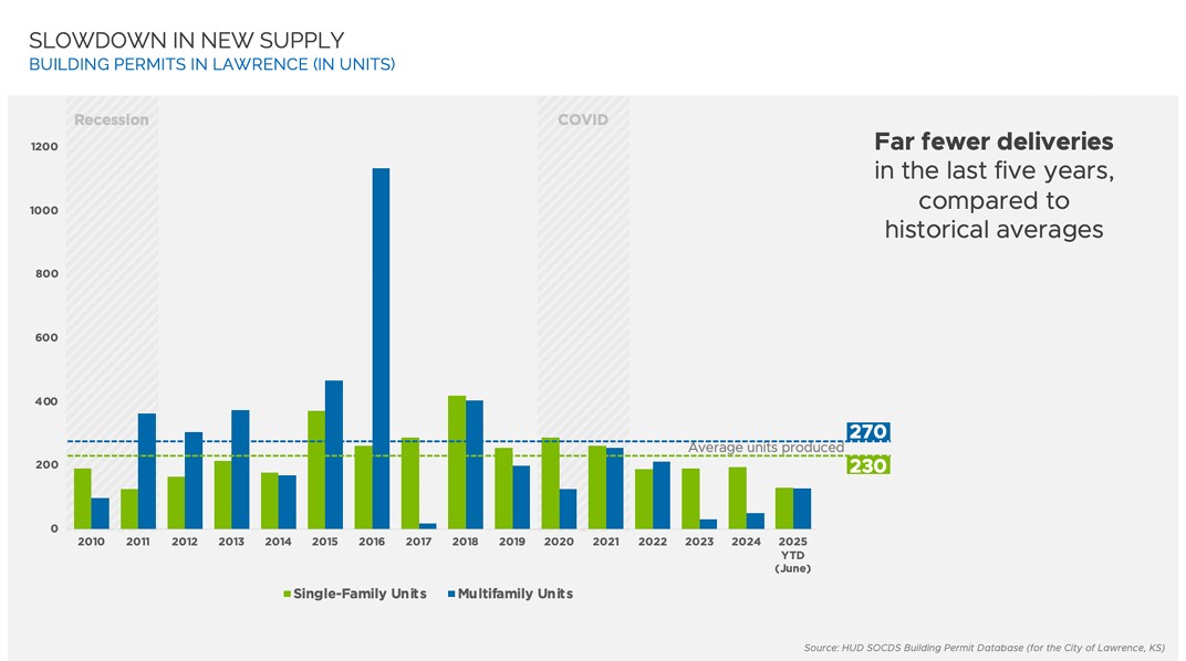The number of building permits for housing units issued in Lawrence from 2010 to 2025.