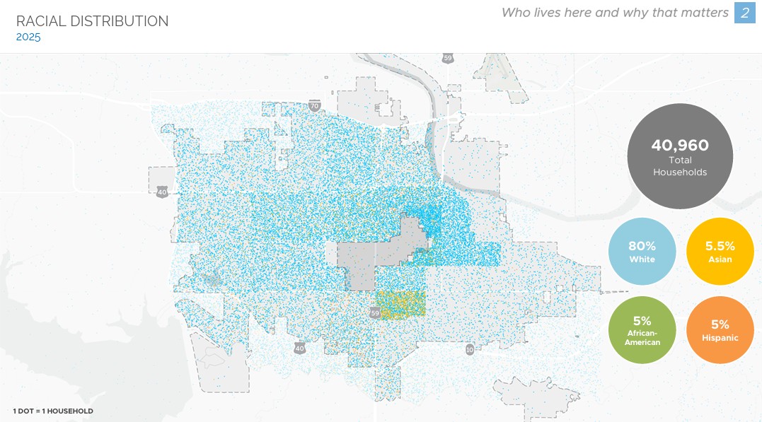 The racial distribution of households in Lawrence in 2025.