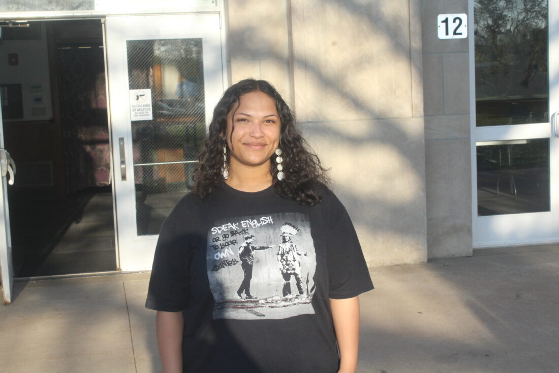 Jade Warrington, the assistant director for the Thunderbird Theatre group’s production of “Wounspe Wanktya—A College Education” poses in front of the Haskell Auditorium, 2425 Choctaw Ave.