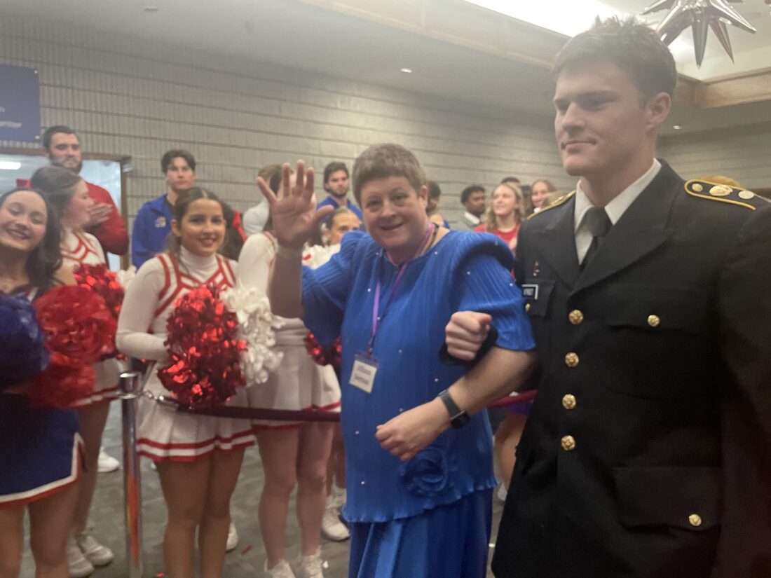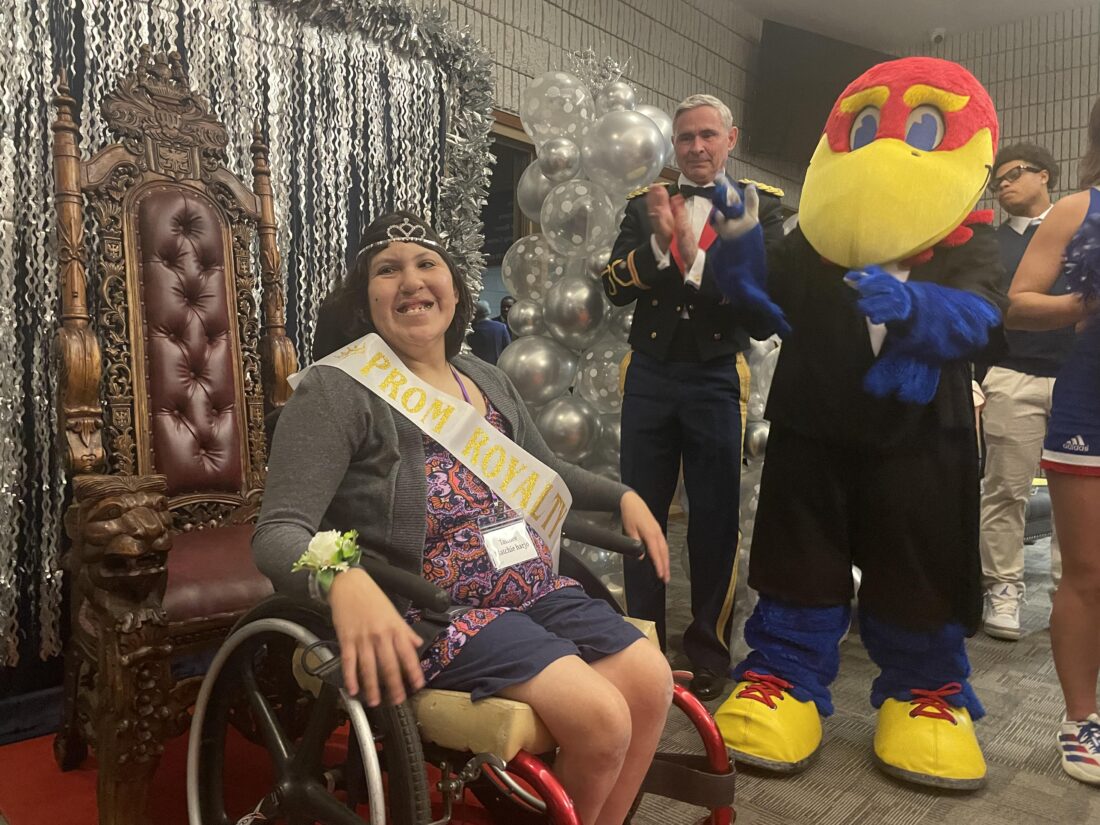The evening starts with a red-carpet procession, where the honored guests are escorted one by one by University of Kansas Army ROTC members and cheered on by cheerleaders, KU football players and mascots like KC Wolf of the Chiefs and Baby Jay. Each guest is crowned a king or queen, then it’s off to the dance floor.