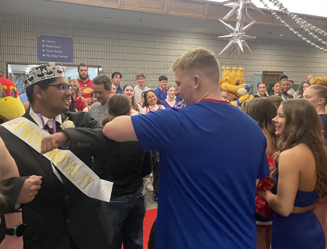 Daniel Saripalli bumps elbows with a KU spirit squad member after being crowned prom royalty at 2026 Night to Shine on Friday, Feb. 13, 2026, at River City Church.
