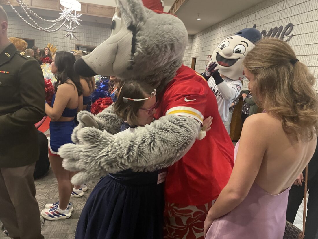 Harper Anderson gets a hug from Kansas City Chiefs mascot KC Wolf at 2026 Night to Shine on Friday, Feb. 13, 2026, at River City Church.