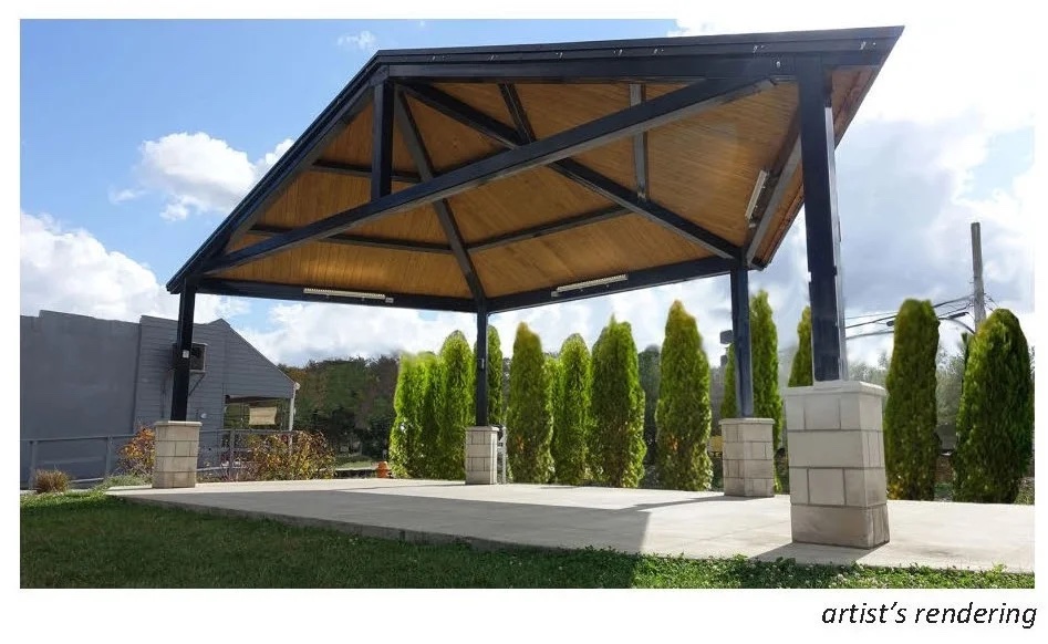An artist’s rendering shows an early concept for a permanent outdoor pavilion that could be built on the Lawrence Public Library lawn.