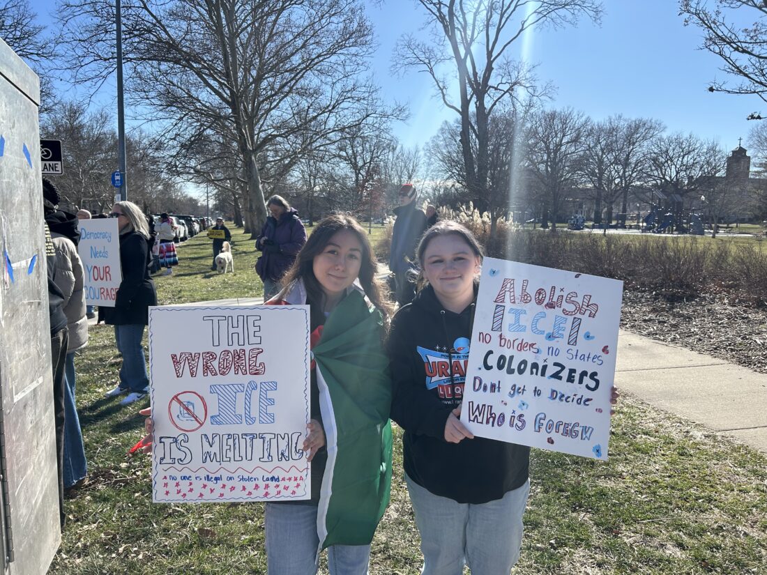 Andraya B. (left) and Isabella Rudisill at the “ICE Out” protest held in Lawrence on Feb. 20, 2026. Rudisill, a student at Haskell, said she wanted to protest to show people who have been targeting during immigration raids “they are not alone.”