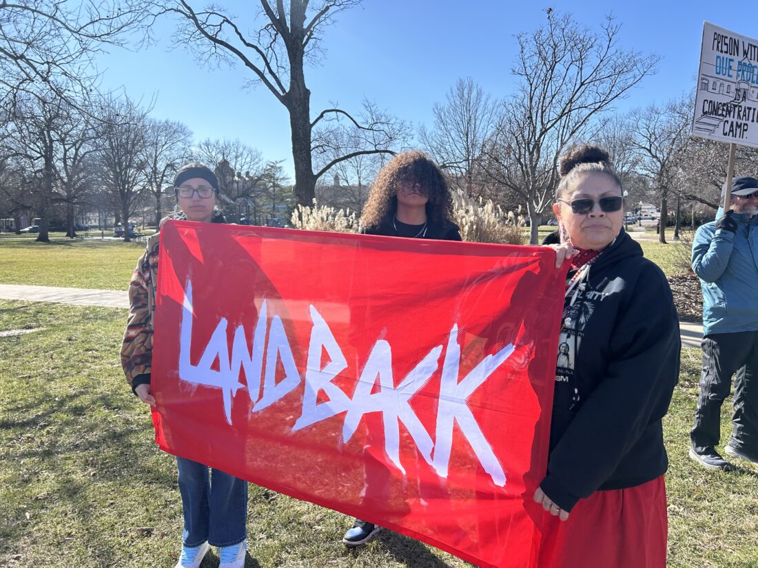 Protestors holding a sign during an “ICE Out” protest in Lawrence’s South Park on Friday, Feb. 20, 2026 saying “Land Back.” The protestors, who said they were Native, said they thought was ICE was doing is “wrong and evil.”