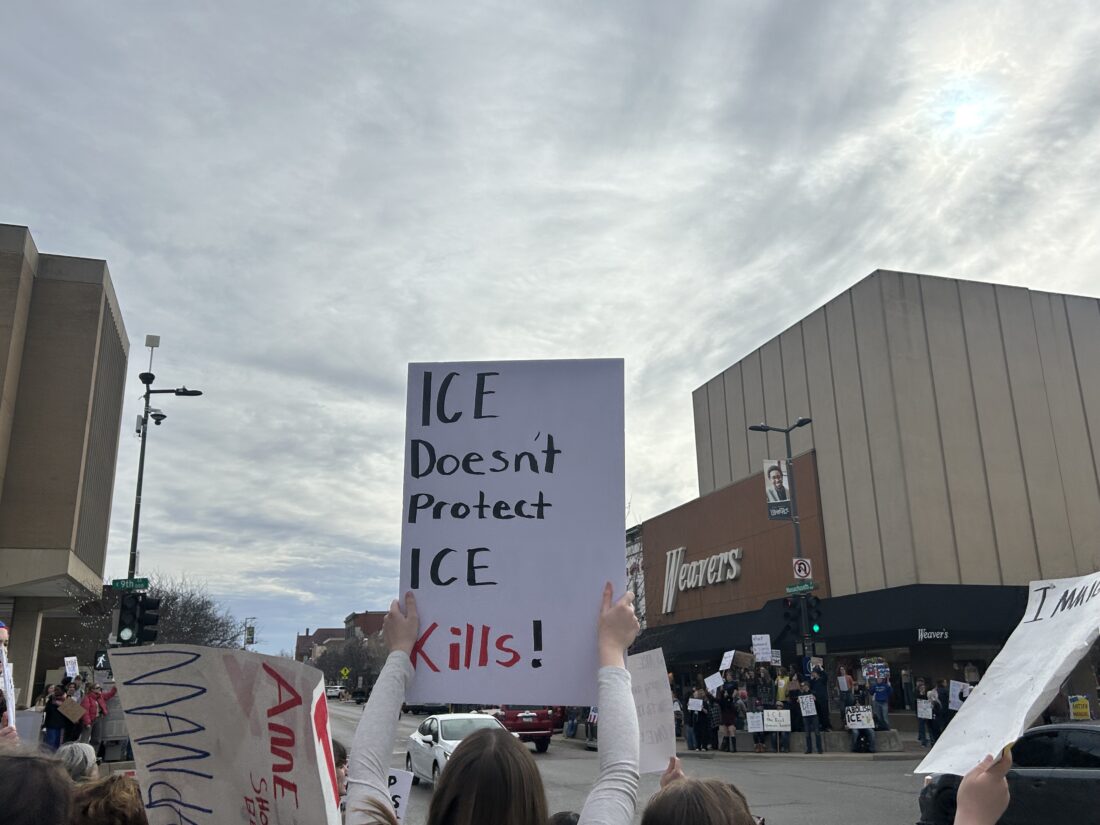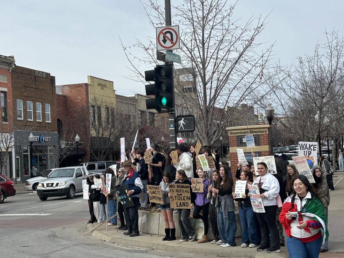 Protesters gather in downtown Lawrence for student-led demonstration against Trump administration, ICE