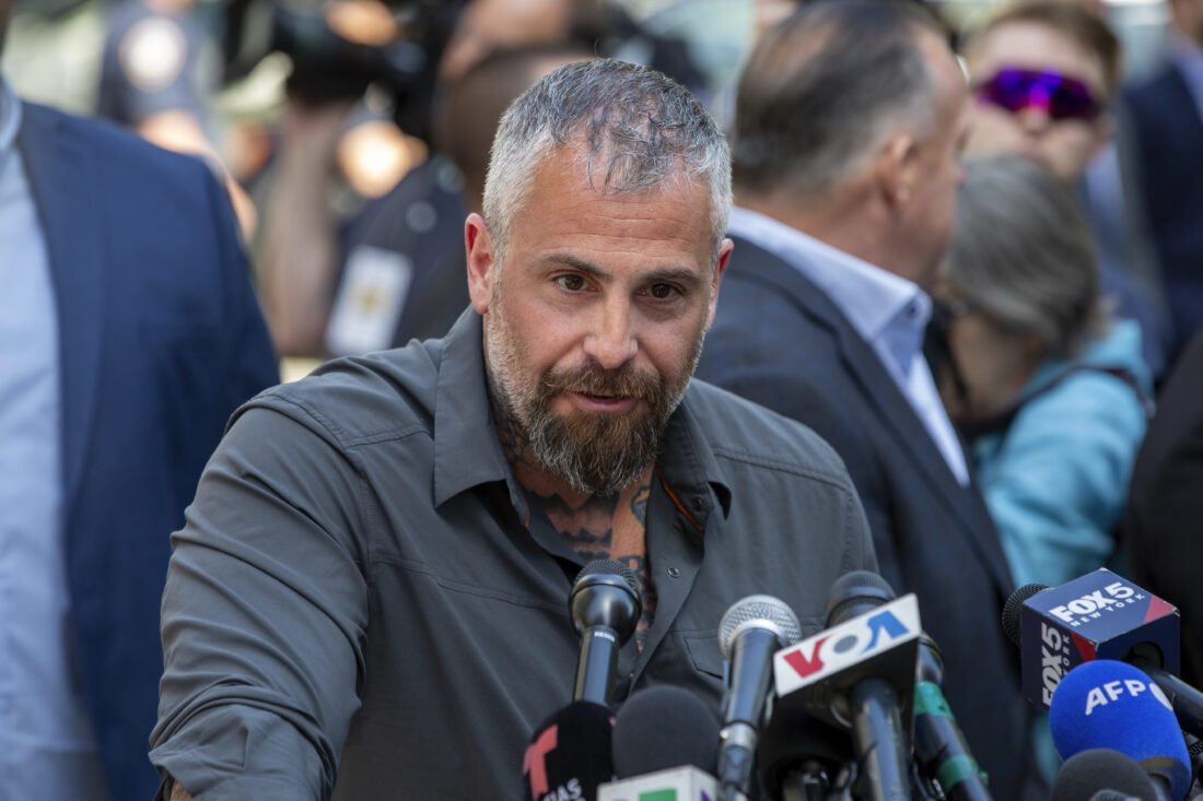 Former Washington, D.C. police officer Michael Fanone speaks in support of President Joe Biden across the street from former President Donald Trump’s criminal trial in New York, Tuesday, May 28, 2024. (AP Photo/Ted Shaffrey)