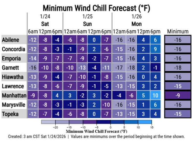 Today, wind chills are expected to range from negative 13 this morning to negative 6 at 6 p.m. this evening. On Sunday, wind chills are forecasted between negative 9 degrees and negative 1 degrees.