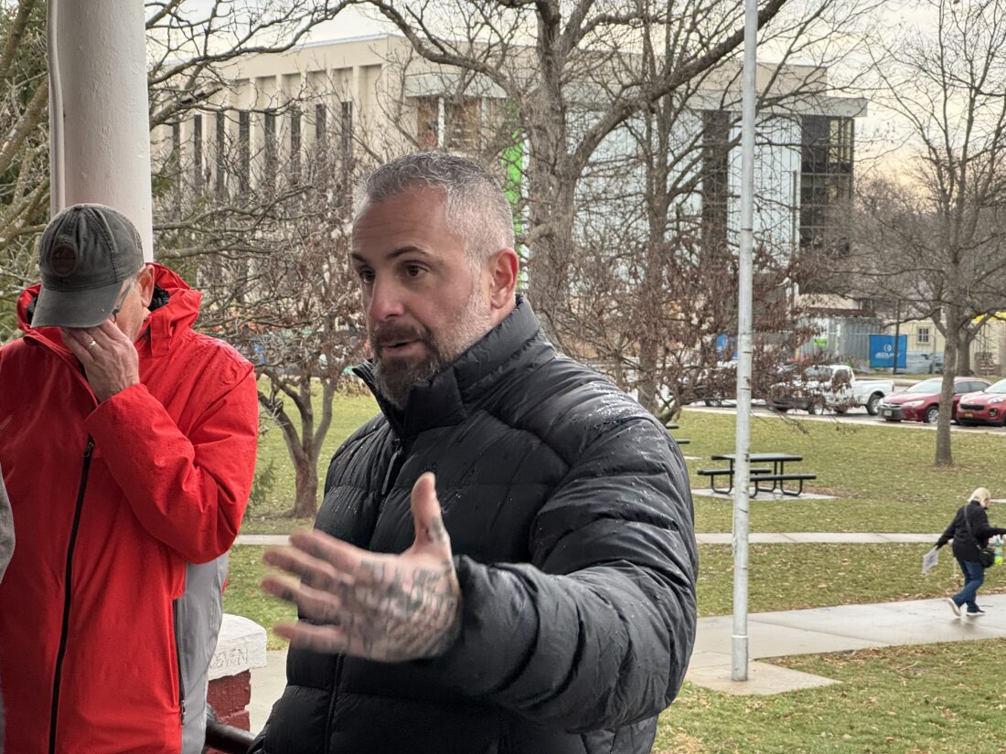 Michael Fanone participates in rally beneath the bandstand at South Park on March 1, 2026.