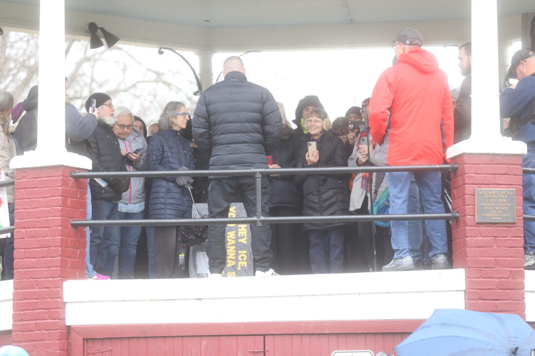 A crowd gathers beneath the bandstand in South Park on March 1, 2026 to hear former police officer Michael Fanone speak about serving at the U.S. Capitol on Jan. 6.