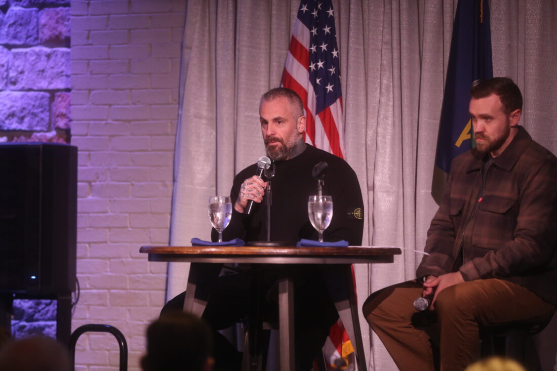 Michael Fanone, left, speaks during a Lawrence event on March 1, 2026. At right is event moderator Noah Taylor of the group Lead Kansas.