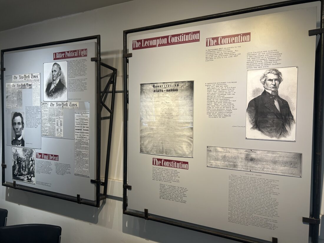 Panels at Constitution Hall in Lecompton detailing the history of the Lecompton Constitution. The document, written in 1857 by the territorial legislature, would have made Kansas a slave state, and led to political backlash across the country and the state.