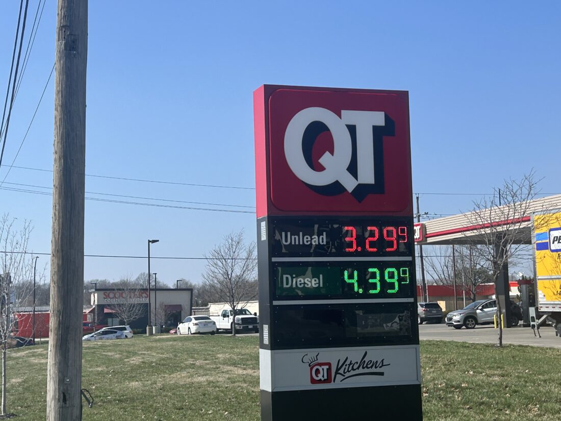 The QuickTrip gas station in Lawrence at 1020 E. 23rd St. listing the price for a gallon of regular gasoline at $3.29 on March 10, 2026. Average gas prices have risen across the country since the U.S.’s attack on Iran, and a KU professor explained the conflict could keep the prices high.