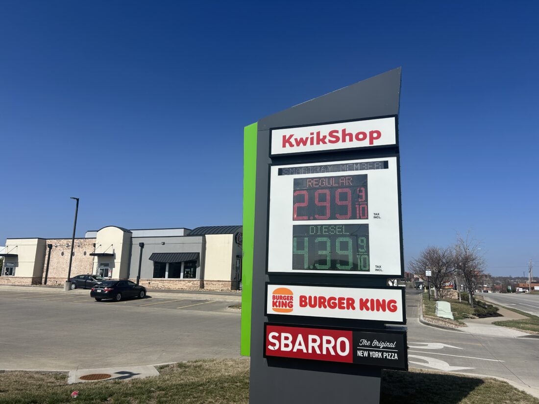 The KwikShop gas station in Lawrence at 2100 W. 25th St. listing the price for a gallon of regular gasoline at $2.99 on March 10, 2026. Average gas prices across the state have increased sharply in the past week, going from $2.698 to $2.962 in the past week in Kansas.