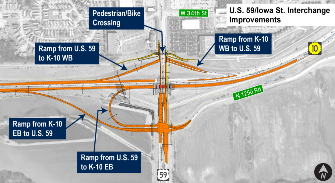KDOT plans to improve the interchange at U.S. 59/Iowa Street by consolidating the intersections on the south side of the interchange with folded diamond ramps, according to its website. In addition to the road expansion project, KDOT will build a pedestrian bridge across Iowa Street north of K-10. The bridge is expected to cost $1.5 million and will be built as part of a cooperative agreement between the City of Lawrence and KDOT for additional local projects.