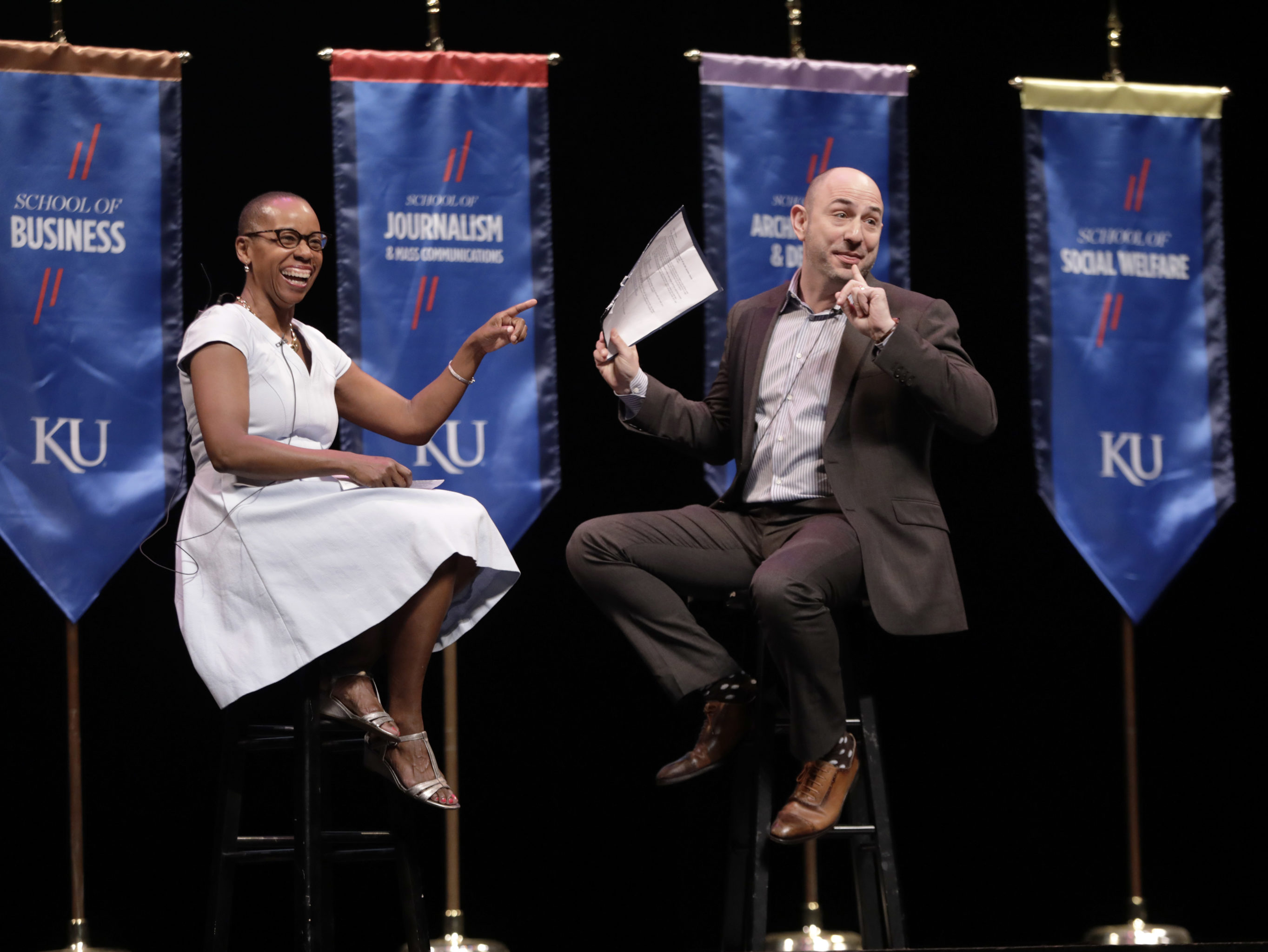Jennifer Hamer, vice provost for diversity and equity, and Carl Lejuez, interim provost and executive vice chancellor, share their college experiences at the University of Kansas’ opening convocation on Sunday, Aug. 19, 2018, at the Lied Center.