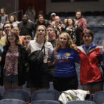 University of Kansas students stand and sing the school's alma mater during KU’s opening convocation Sunday, Aug. 19, 2018, at the Lied Center.