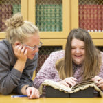 University of Kansas students Marisa Haselhuhn, left, and Jerika Miller thumb through the pages of one of many versions of Aesop's Fables Thursday, Oct. 11, 2018, at the Spencer Research Library. The students along with the rest of their World Literature class spent part of the morning at the library, which is celebrating its 50th anniversary.