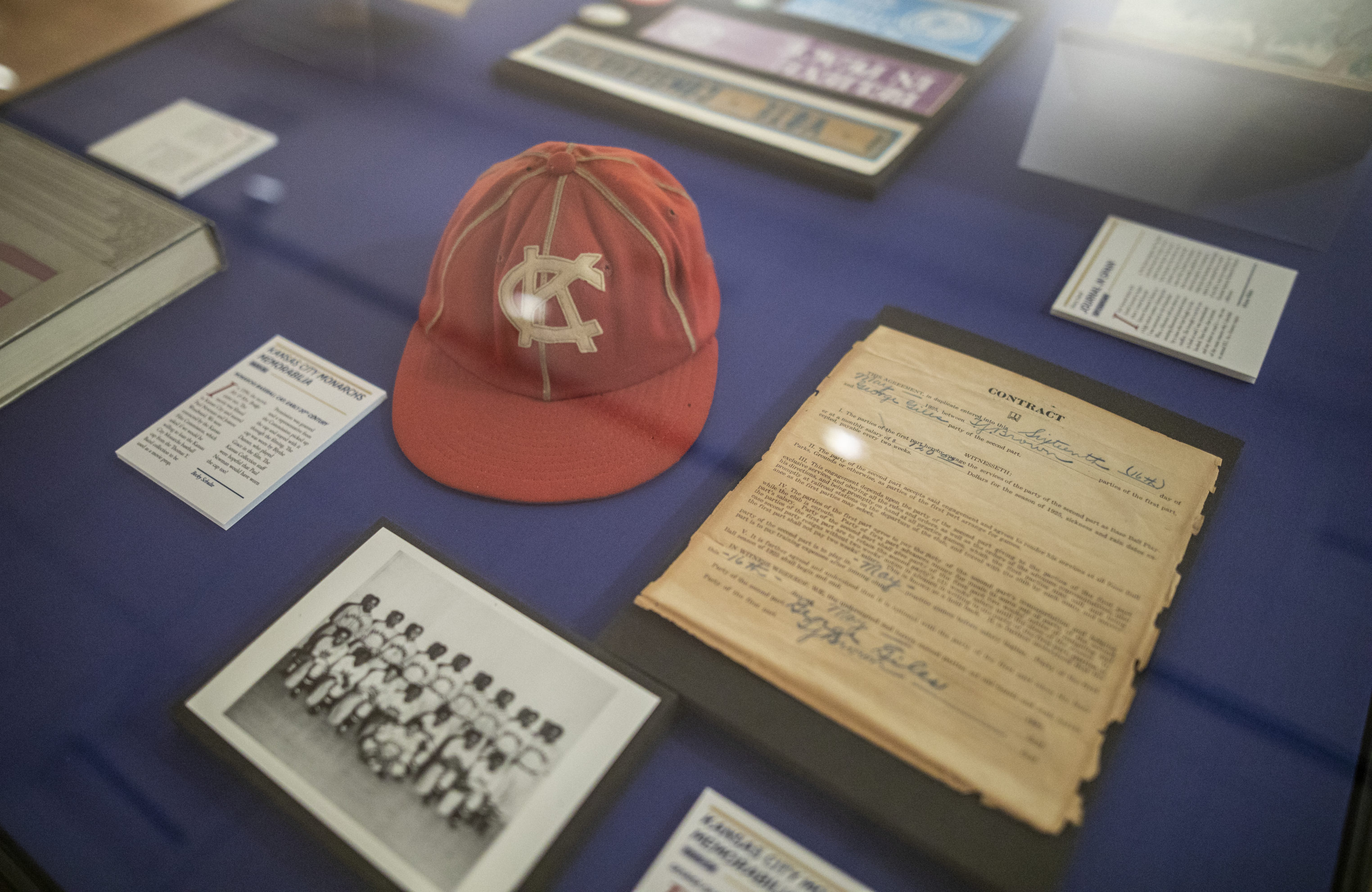 Nearby is Kansas City Monarchs memorabilia, including a red baseball cap from the Negro Leagues and a picture of the 1934 team, from the Thomas Y. Baird collection.