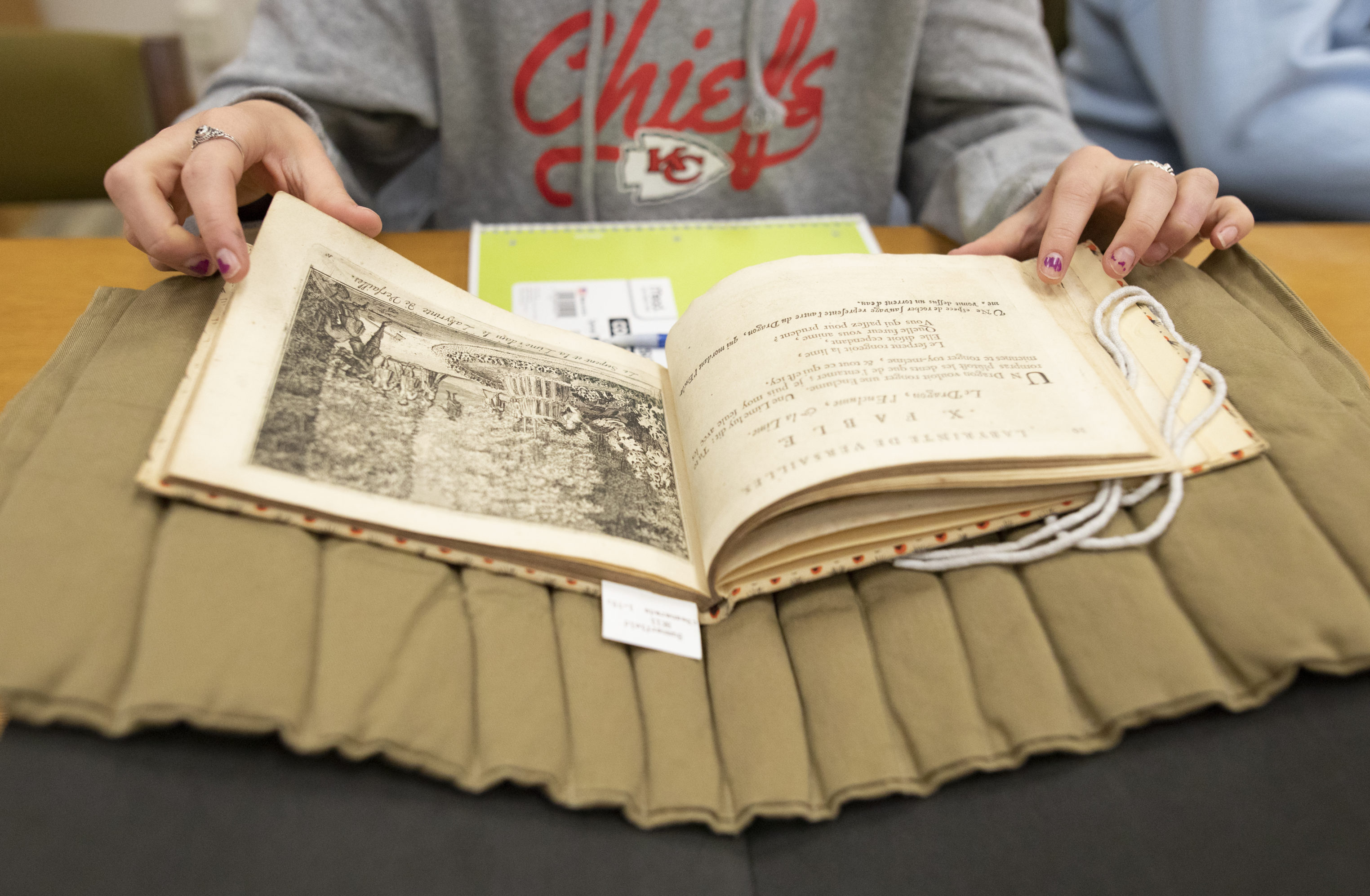 A World Literature student flips through the pages of an older version of Aesop’s Fables on Thursday, Oct. 11, 2018, at the Spencer Research Library. The oldest version of the book the library owns dates back to 1517.