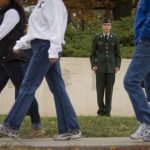 In this file photo from November 2011, Army ROTC cadet Jeffrey Ahle stands at attention at the Vietnam Memorial on KU’s campus.